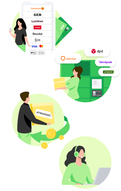 Klients vēlas atgriezt preci? Piedāvājam tirgū labāko naudas atmaksas sistēmu, kurā atmaksu varat veikt turpat no e-veikala vadības paneļa, turklāt, bez komisijas maksas. Ja naudas atmaksu skaits ir liels, tad mūsu API savienojums ļauj tās pilnībā automatizēt. Uzzini vairāk →