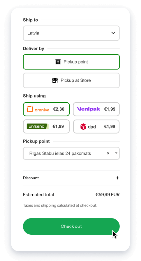Ar jauno piegādes moduli vari piedāvāt vēl plašāku piegādes izvēli. Papildus esošajiem piegādātājiem esam pievienojuši arī Venipak un Unisend, kas nozīmē lielāku elastību un labāku piegādes pieredzi dažādos reģionos.