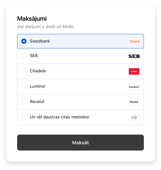 Interneta banku un karšu maksājumi parādās tieši Checkout maksājumu sarakstā – ātrāk, skaidrāk un ar augstāku konversiju.