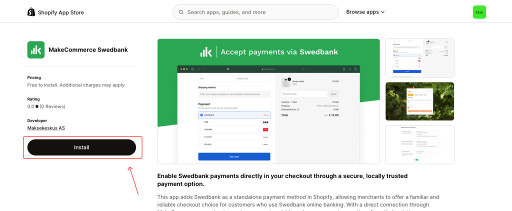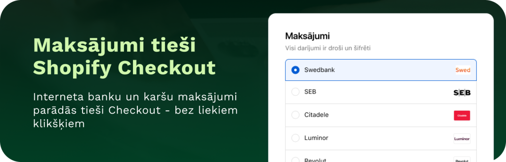 Jaunie MakeCommerce Shopify moduļi nodrošina banku un karšu maksājumus tieši Shopify Checkout vidē. Atšķirībā no iepriekšējās versijas, tagad katram maksājuma veidam ir savs atsevišķs Shopify app.