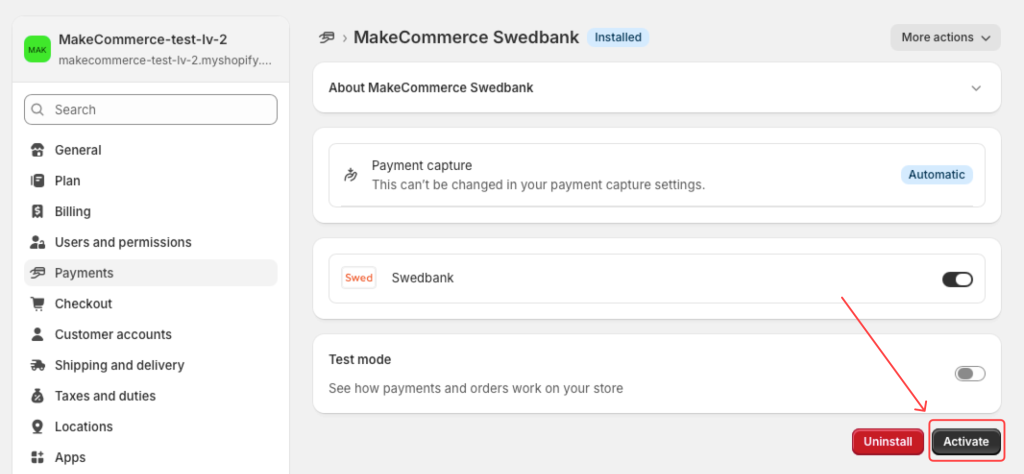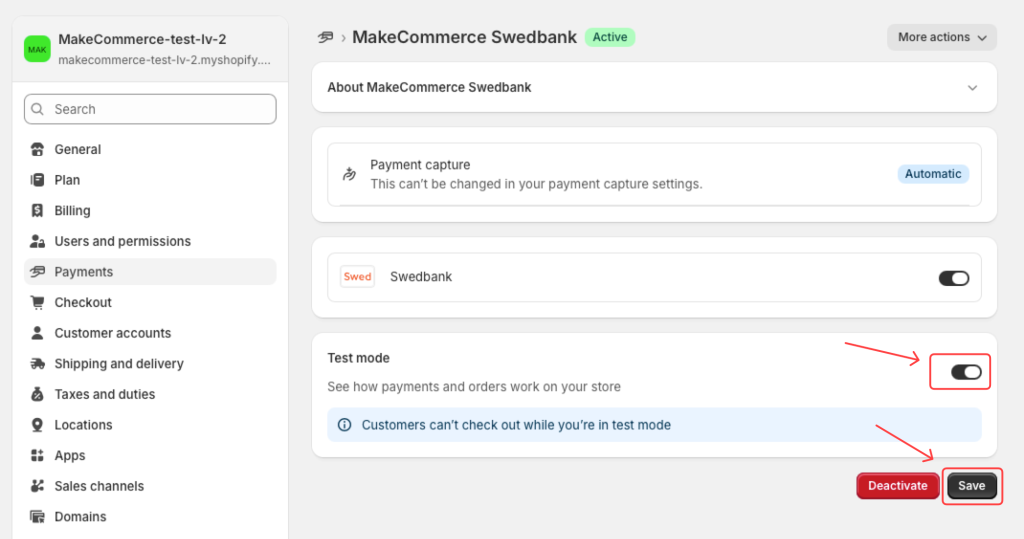 Ja vēlies veikt maksājumus testēšanas režīmā, to ir iespējams izdarīt, atverot maksājuma metodes iestatījumus un ieslēdzot Test mode un Save: