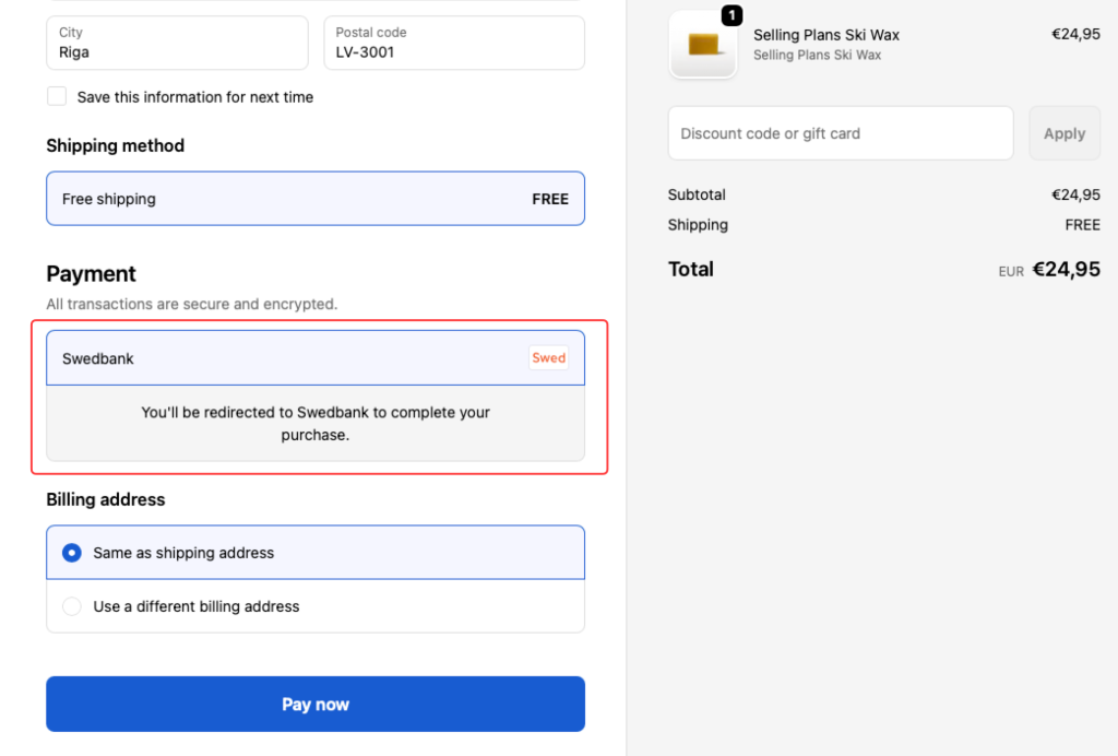 - Uzstādīšana ir pabeigta. Varat doties uz sava veikala checkout sadaļu, lai pārliecinātos, ka maksājumu metode tiek izvadīta. Ja LIVE vidē, maksātājs tiek pārvirzīts uz interneta bankas lapu, maksājuma metodes pievienošana ir veiksmīga.